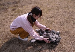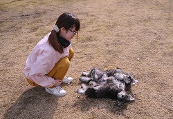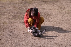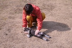 《主従関係》が出来ると、次に《信頼関係》を。 犬を上向けに寝かせます。 最初は身体に力が入っていましたが優しくお腹を撫でているとリラックスしてきました。 信頼する人には安心して心を開いてくれます。《服従の体勢》 |