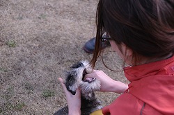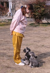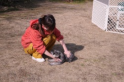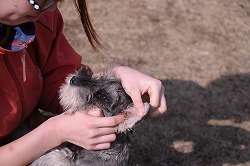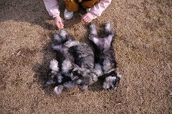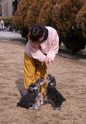 信頼関係が出来ると、口の中に指をいれたり(上左)、耳の中に指を入れたり(上中)、 「伏せ」といってお尻の部分を軽く押さえると素直に指示に従うようになりました(上右)。 下段の写真のように、指示を受けて素直に態度に現せるようになれば合格です。 ちなみに、写真のシュナウザーは生後2ヶ月で本日が訓練初日です。 |