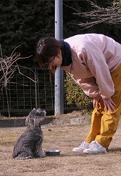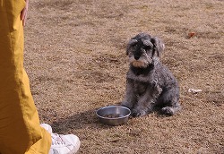 今日は訓練の基本中の基本と言える「待て」を教えます。 フードを入れた食器を持って、しっかりとアイコンタクトをとり「お坐り」の姿勢をさせます。 短くはっきりとした口調で「待て!!」と声をかけ、同時に手で(写真のように)制御します。 始めは意味が理解できず食べようとするでしょうが、間髪をいれず「ダメ!!」といって 制御します。何度か繰り返していくうちに「待て!」の意味を理解するようになりました。 |