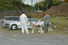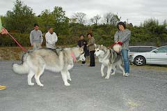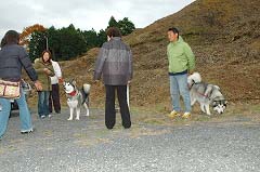 | 次々と到着してくる方は、挨拶もそこそこに先ずはワンちゃん同士のご対面です。みんなこの地で生まれた兄弟姉妹でも、警戒心で最初はシッポも下がっていますね。 | ||