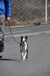 合宿も9日目になりました。 滋賀県の谷口ブルムちゃん(2歳1ヶ月の女の子)です。 散歩時に引っ張る悪いクセが悩みでしたが、今では写真のように 落ち着いて歩けるようになりました。 ハンドラーの左側について、歩行速度もハンドラーに合わせて歩くことが基本です。 リードのたるみ具合を見れば、無理な引っ張りの無いのが分かると思いますが、歩くときも主導権はあくまでハンドラーです。 |