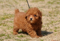 こちらは京都の宮城様ご予約のトイプードルの女の子です。 上の写真の男の子とは同胎の”兄妹”です。 小さな身体を躍動させ、走るというより跳ぶような動きは、とても女の子とは 思えない(失礼)俊敏さです。 普段はとても人懐っこくて可愛い女の子なんですよ。 |