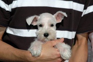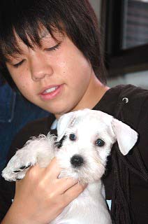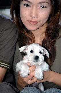| 台風接近中のなか、兵庫県 加古川市より石崎様ご家族がホワイト・シュナウザーの男の子を迎えに来られました。元気な子とのご希望でしたが、スクスクと順調に 発育してくれました。 でも、まだまだ仔犬ですから抵抗力は充分ではありません。 とくに、急に気温が下がりだしたこの頃です。風を引かさないよう注意してやって下さい。 |