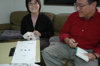渡辺様御夫妻がホワイト・シュナウザーの男の子を迎えに来られました。御夫妻の人柄が偲ばれる 様で、この子のために立派なファイルを用意され、表紙には『クルク』と名前が書かれています。 ドイツ語で【賢い】と言う意味だそうです。期待の大きさを『クルクちゃん』は分かっているのかな? 御夫妻の愛情で,キットいい子になってくれる事でしょう。 |