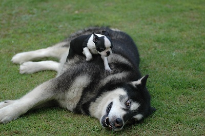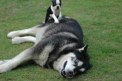モトコランドでは最年長ということもあって、文字通り”ボス”として君臨し、仲間を守るためには身をもって外部の人や犬に向かっていく”男気”があった。 子供の頃から、目を離すと1メートル以上あるフェンスを乗り越えて小型犬の運動場に進入し、みんなと遊んでいたね。 「仲間には優しく、子犬にはより優しくなるシュウ」は、そんな幼少からの生活習慣から身についたのだろうか。 反面、プライドが高く、自分たちの縄張りに近づくものには、歯を剥いて攻撃する荒っぽさがあったのに、子犬達を見かけると、近寄って遊んでやる優しいお兄さんになるんだよ。 子犬達も、自分たちの何十倍もの巨体なのに、怯えることもなく遊んでもらっていたね。 きっと、犬たち同士だけに分かり合えるサインがあって、こんな小さな子犬にも”敵意”が無いことが伝わっているのだろう。 モトコランドで育った子犬達は、外へ出る頃になるとシュウからこんな洗礼を受けることが慣例となっていた。 |