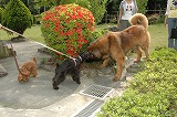 大阪府より徳原様ご一家が、プードルとシュナウザーの女の子を連れて『里帰り』。 愛犬家ご一家で、今度は、ホワイト・シュナウザーを予約されました。 シュナウザーはご主人が事の他、可愛がっておられるそうでブラックとホワイトの、好対照な毛色は 楽しみですね。 レオンベルガーの「大名」とのご対面にも、物怖じすることない両犬に「大名」のほうが、とまどっていました。 |