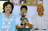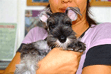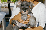三重県の生川様ご家族が、M・シュナウザーの女の子を迎えに来られました。食欲旺盛、元気一杯です。 ご主人は、歯科医師だそうですが、ワンちゃんも健康な歯を維持してやる ことが大切です。歯磨きや歯石取りの習慣は早くからはじめるようにしてください。 |